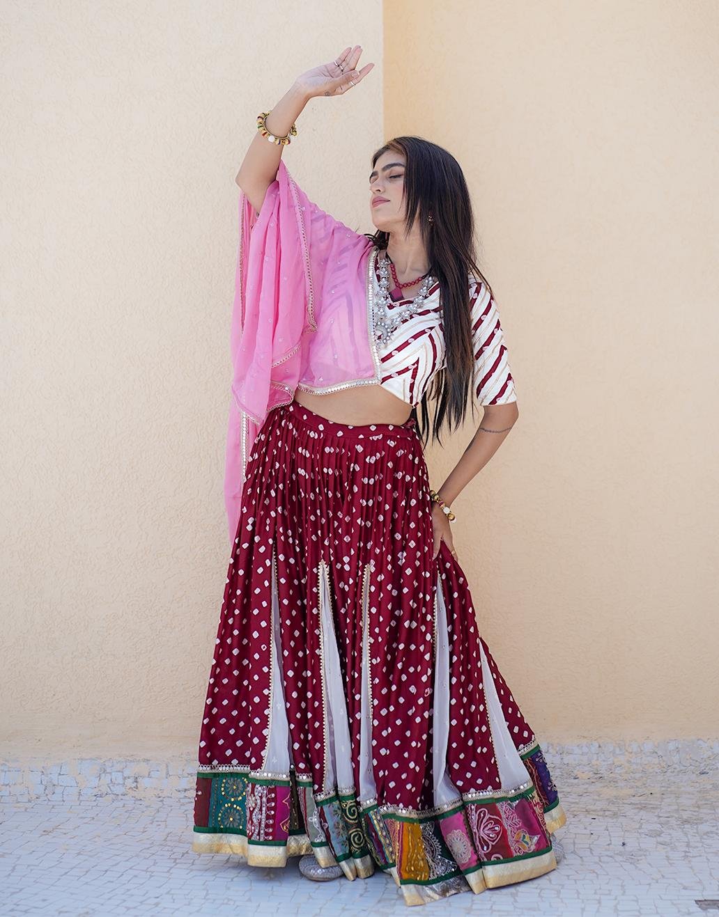 Luxurious Modal Silk Chaniya Choli featuring traditional Bandhani and a vintage border. Paired with a lightweight Chiffon dupatta with Mukaish work and golden lace.