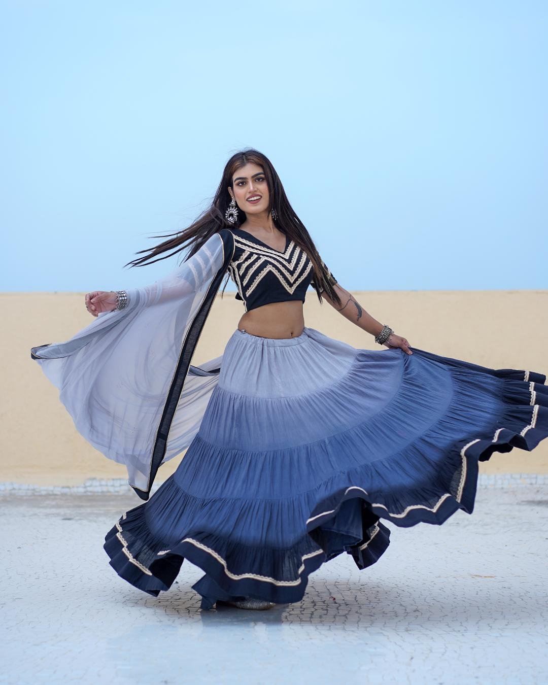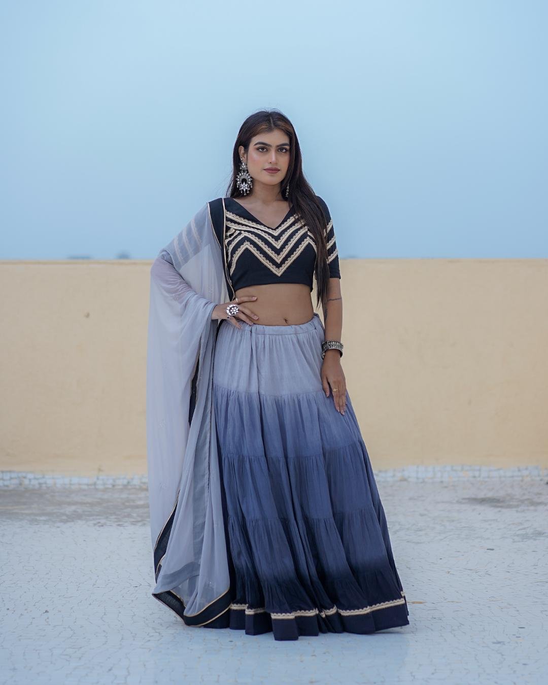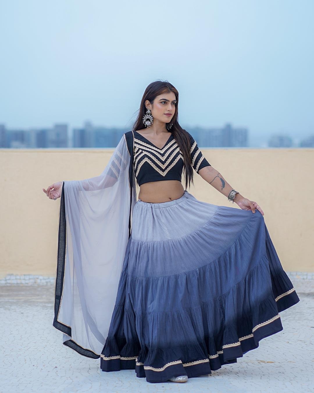 Modern Ombre-colored Mal Cotton Chaniya Choli set with a Chiffon Silk dupatta highlighted by Mukaish work and a sophisticated black border.