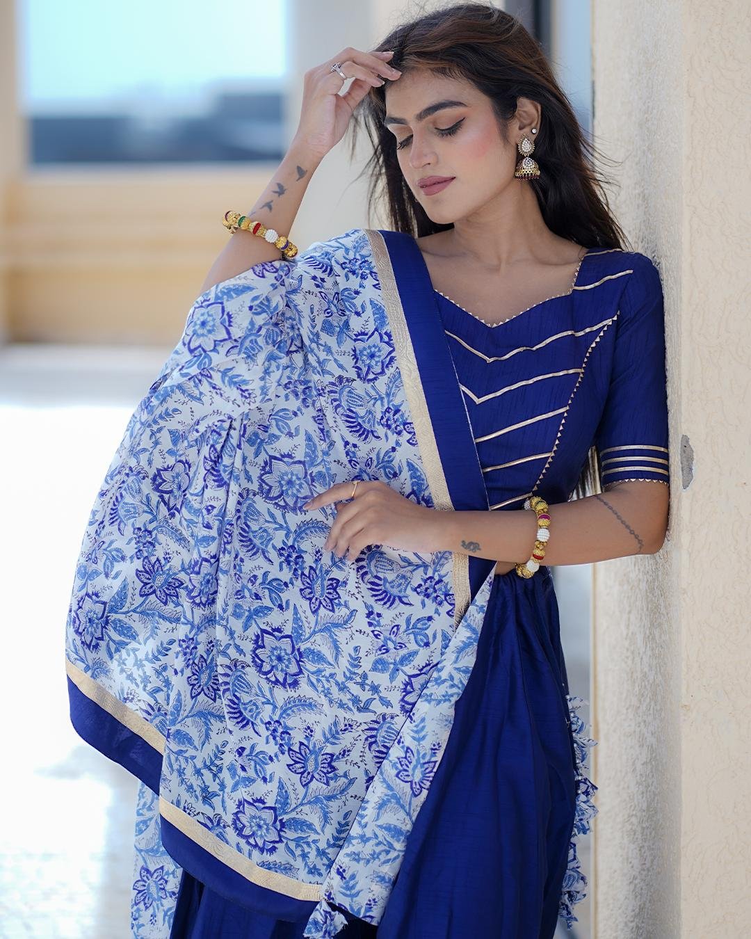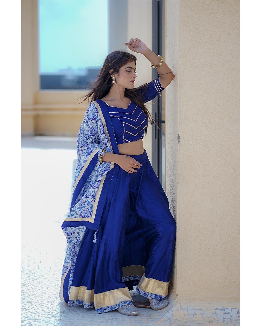 Flowy Dola Silk Chaniya Choli (10 Mtr Flair) with a matching blouse and a Mal Printed dupatta with a blue border.