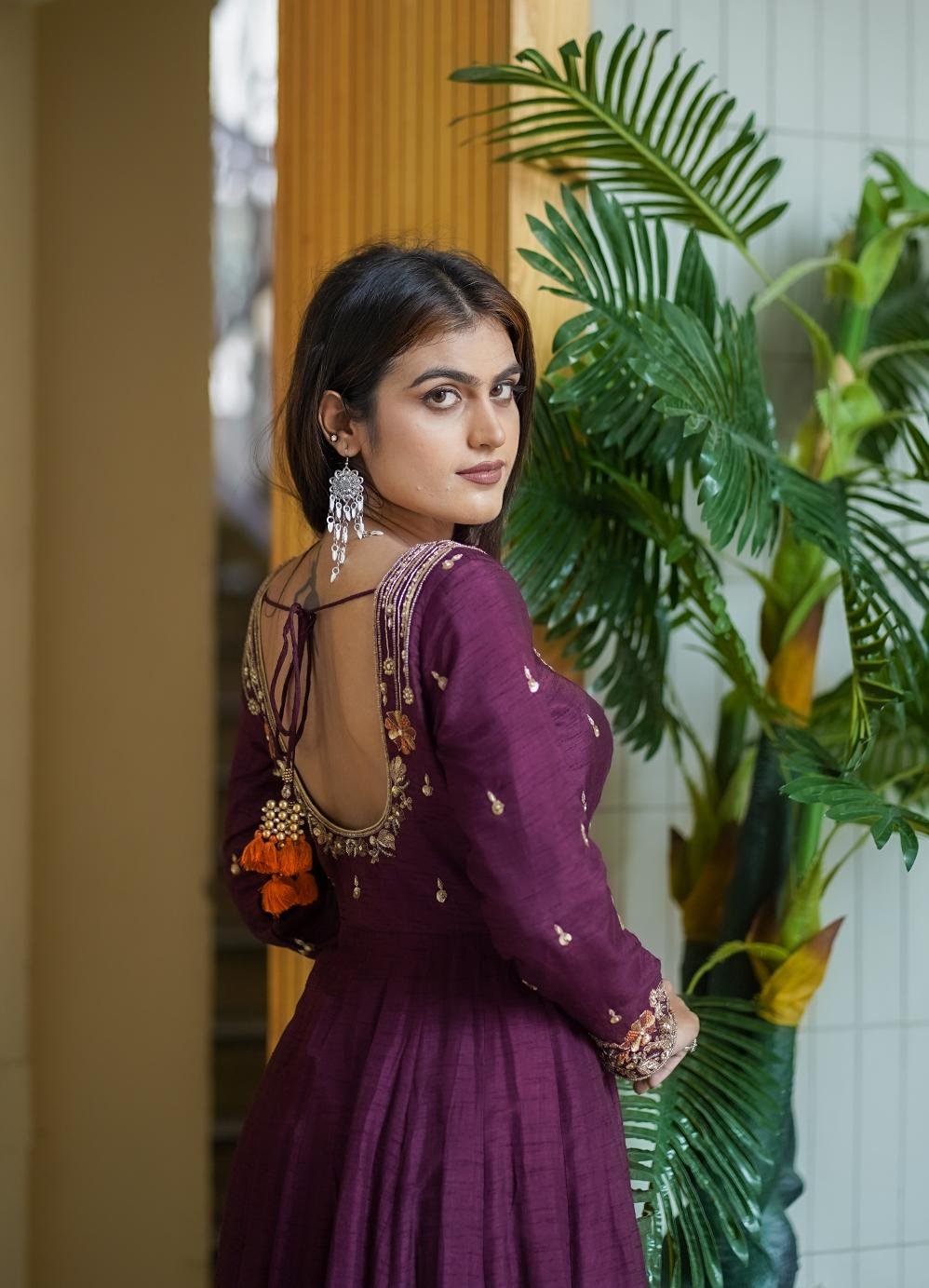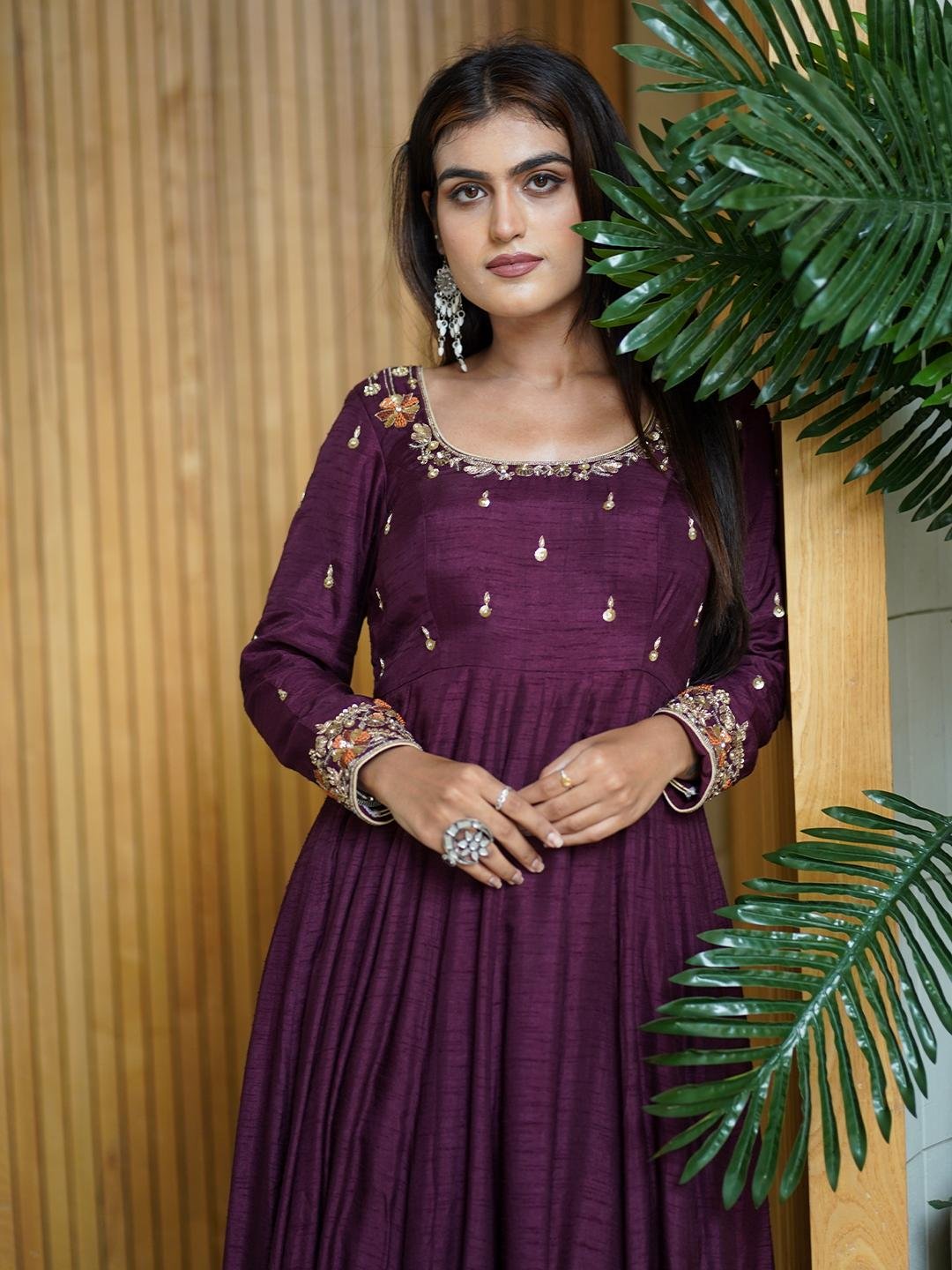 Luxurious Dola Silk Anarkali Dress with a flowy 6-meter flair, detailed with traditional Khatli Work.