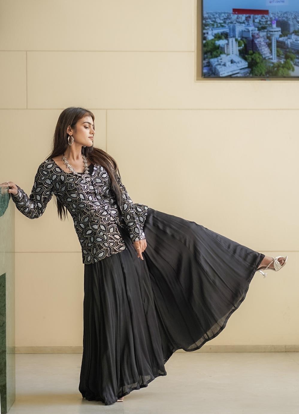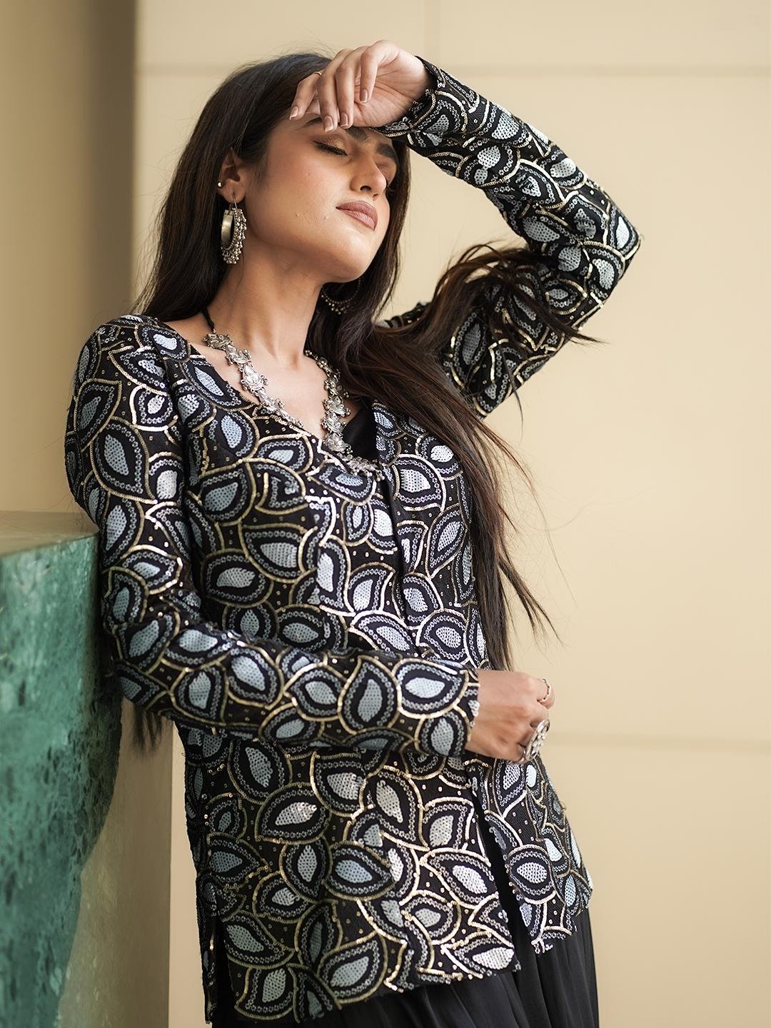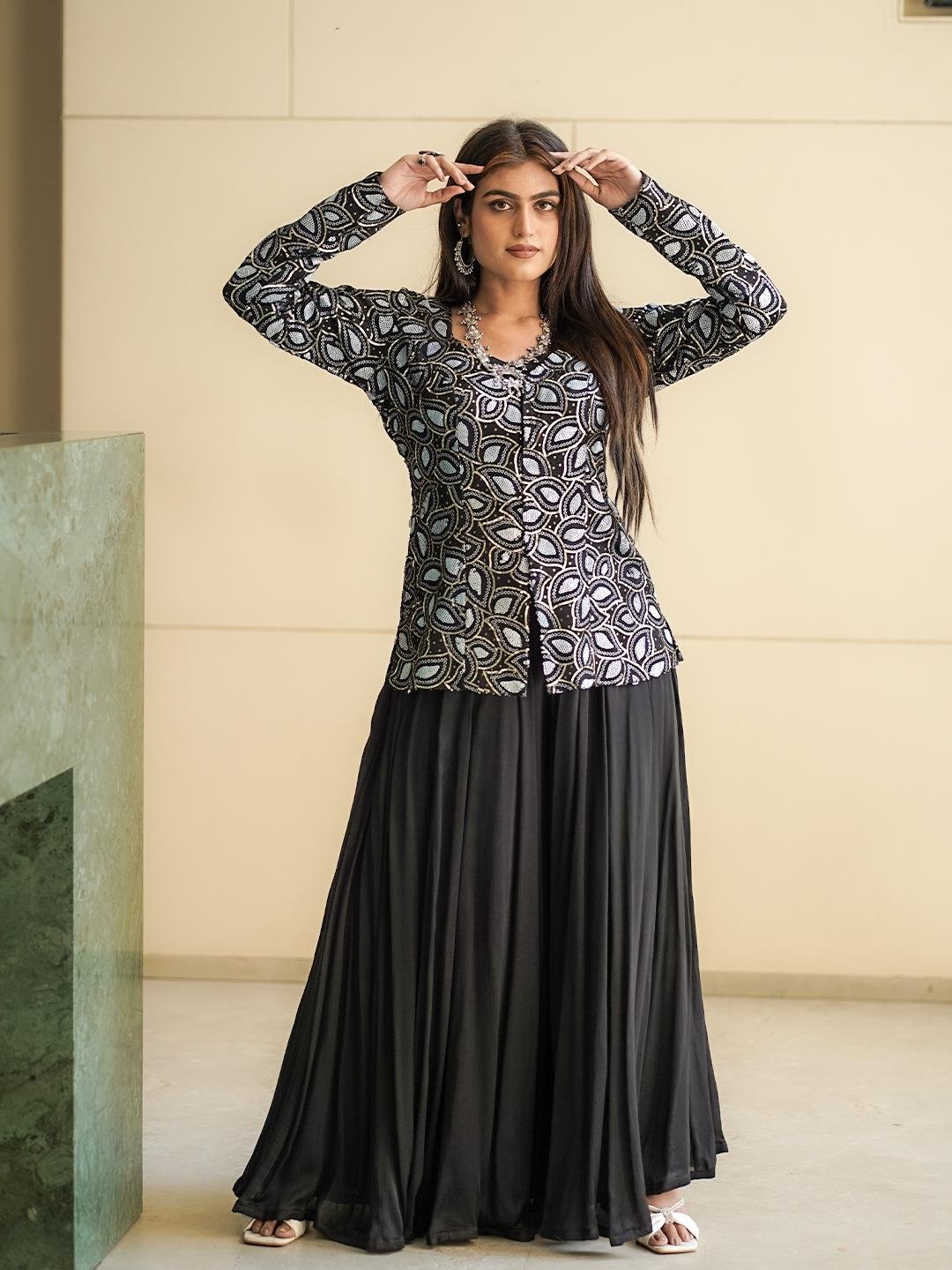 Trendy 3-piece Indo-Western set in Modal Silk, featuring a crop top, palazzo, and matching jacket with sparkling Sequins Work.