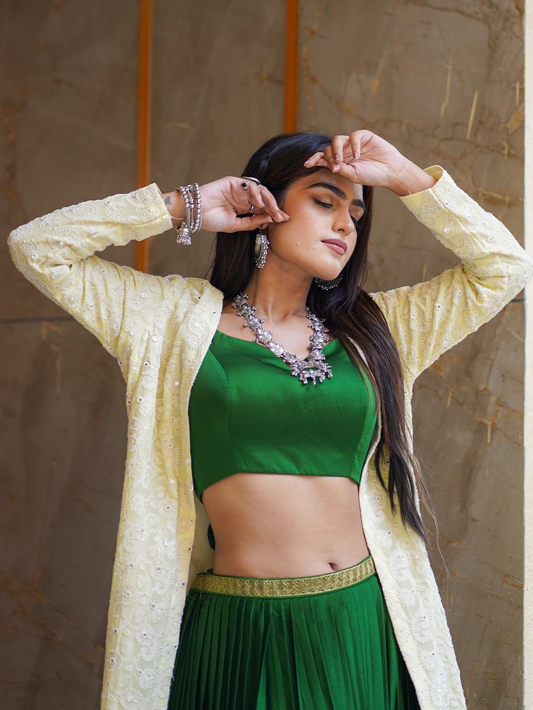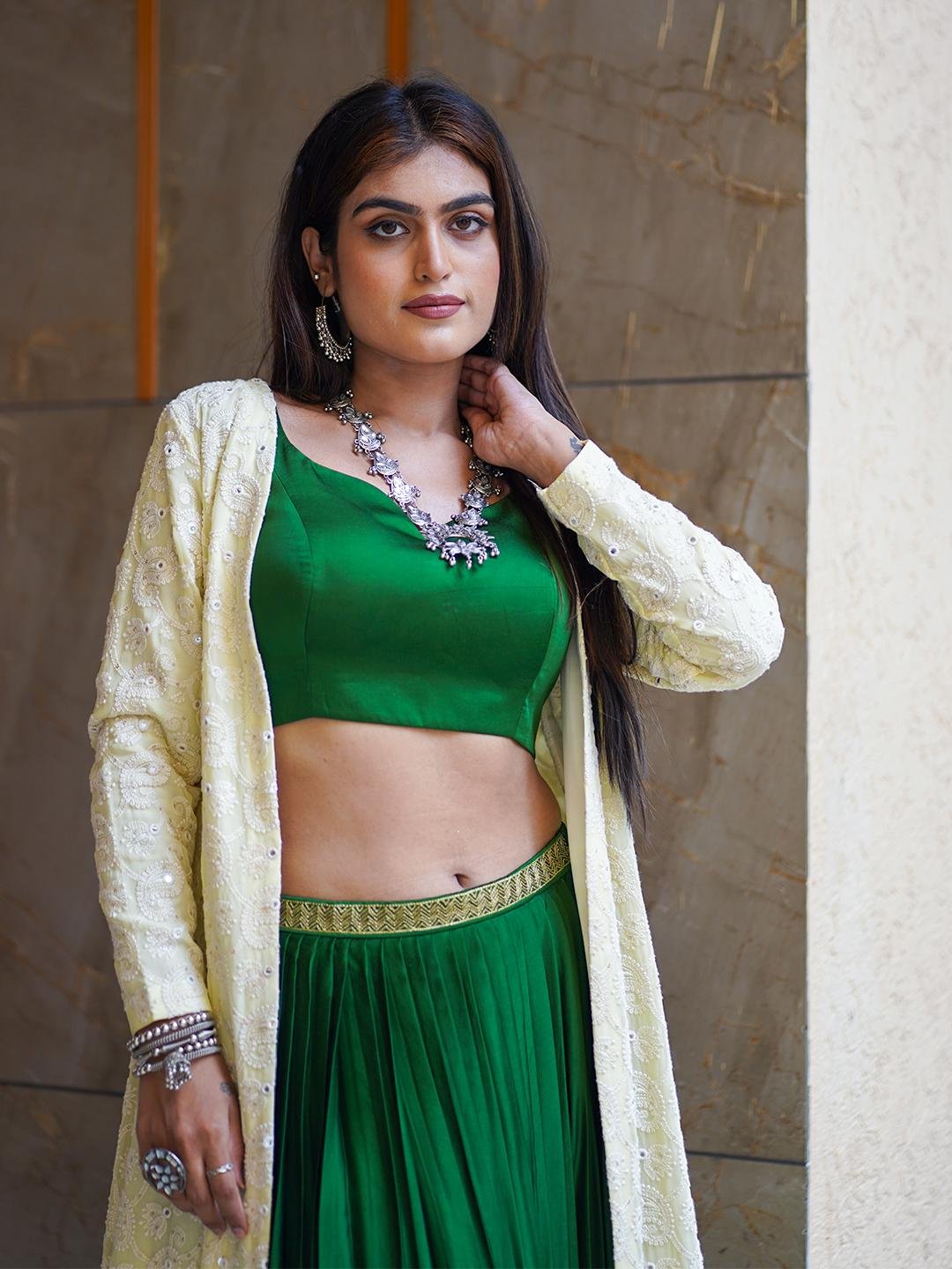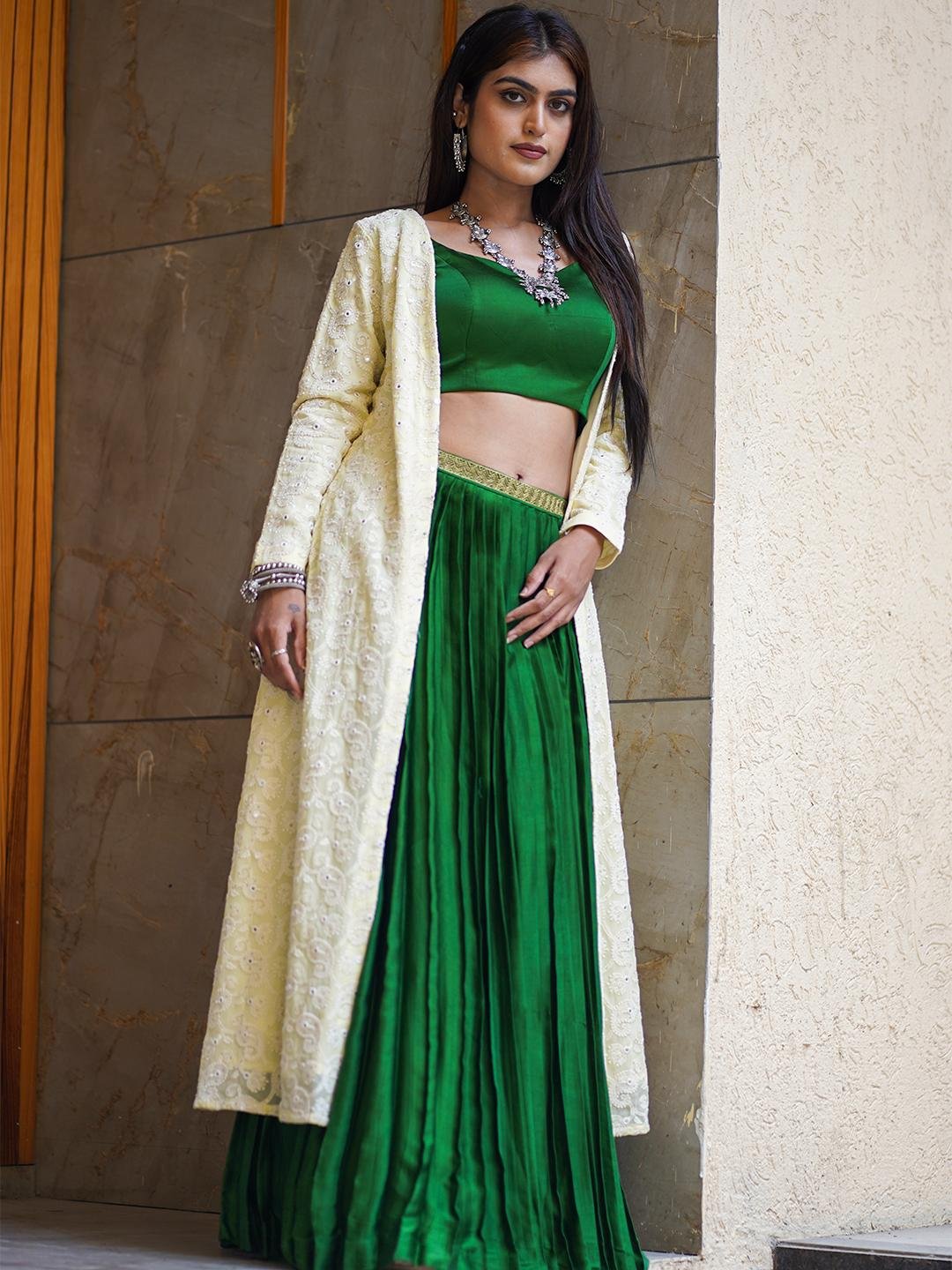Stylish 3-piece Indo-Western ensemble: Modal Silk crop top, pleated palazzo, and a Long Jacket in Lucknowi fabric.