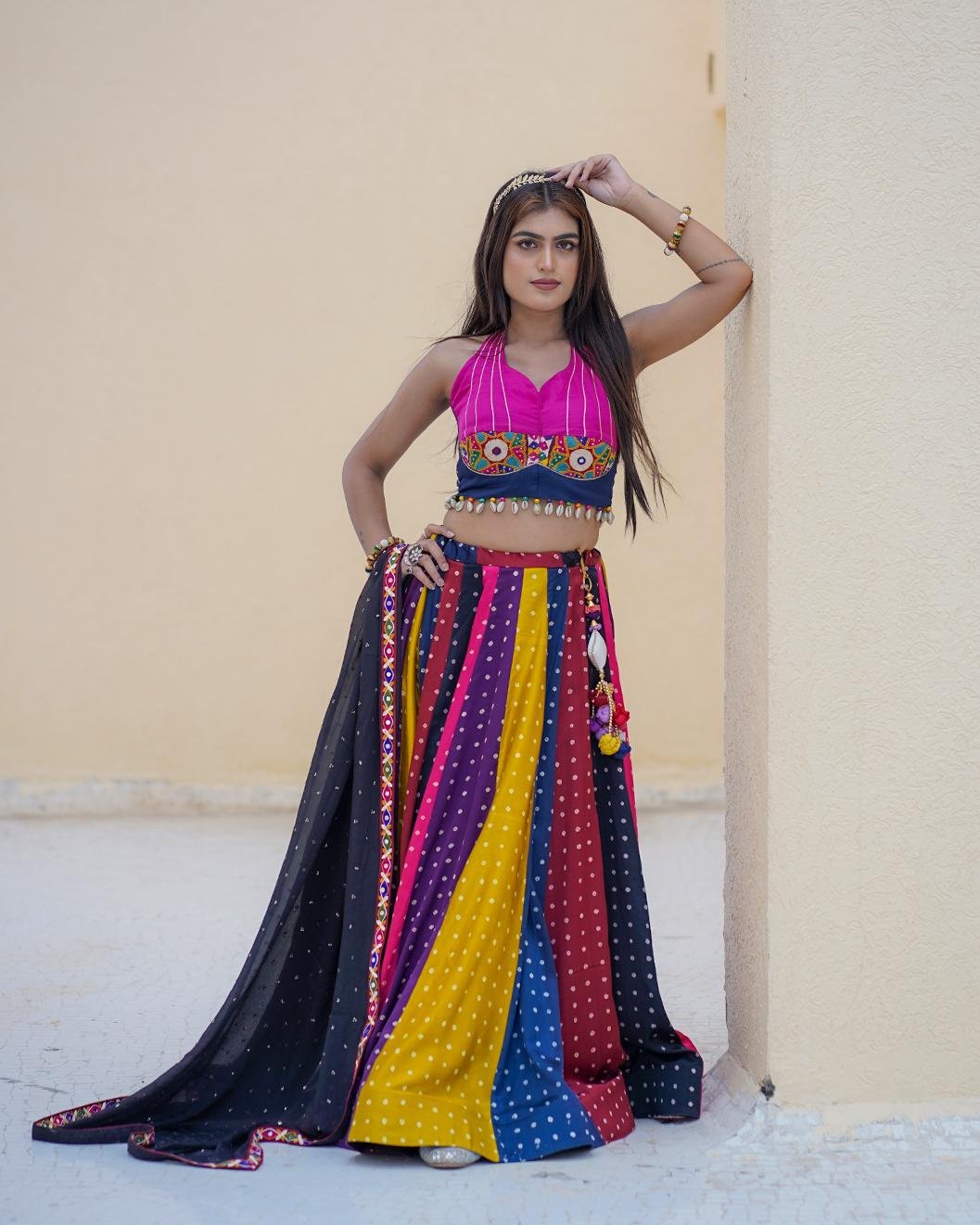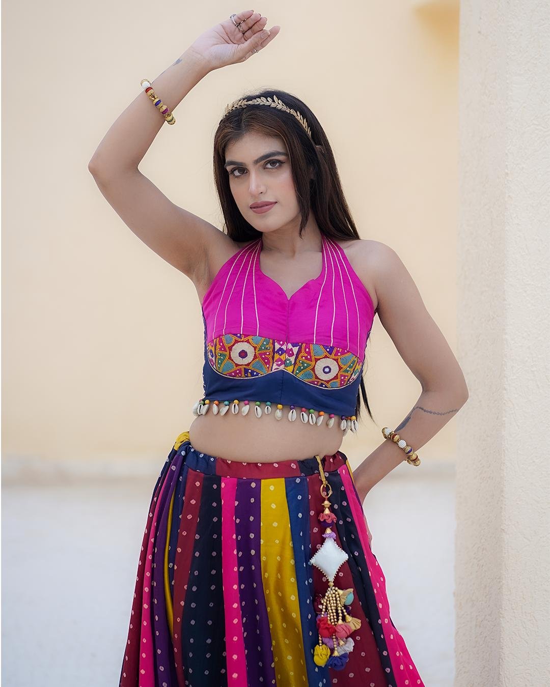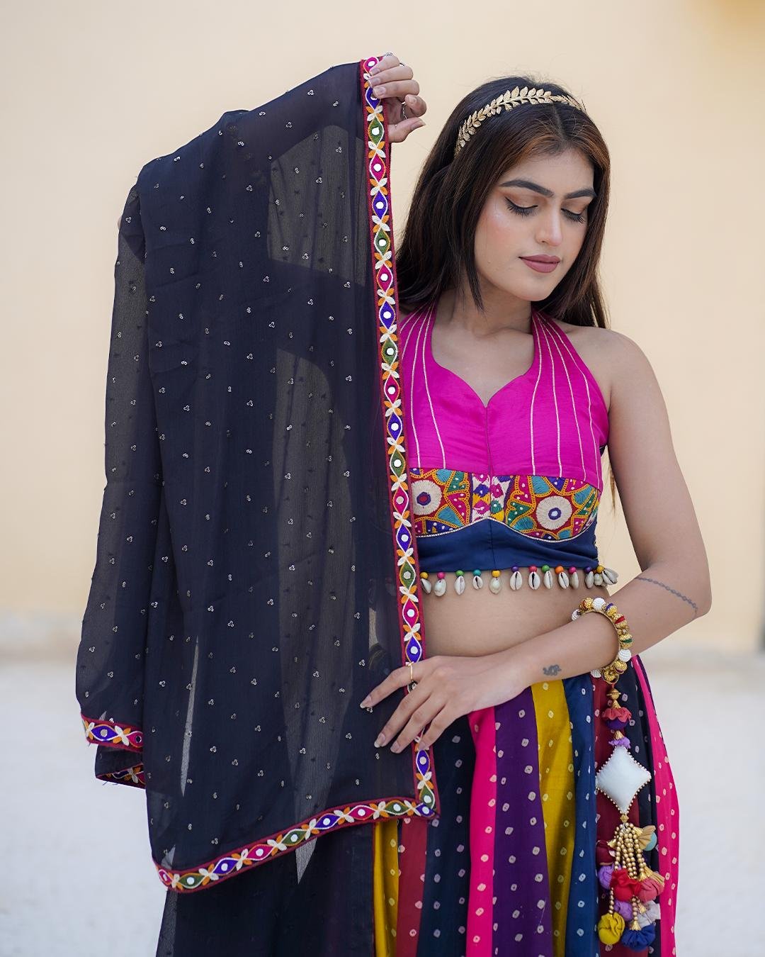 Vibrant Multicolor Bandhani lehenga in premium Gaji Silk. Features a stylish Halter Neck blouse with Kachi work and a Georgette dupatta with a traditional Gamthi border.