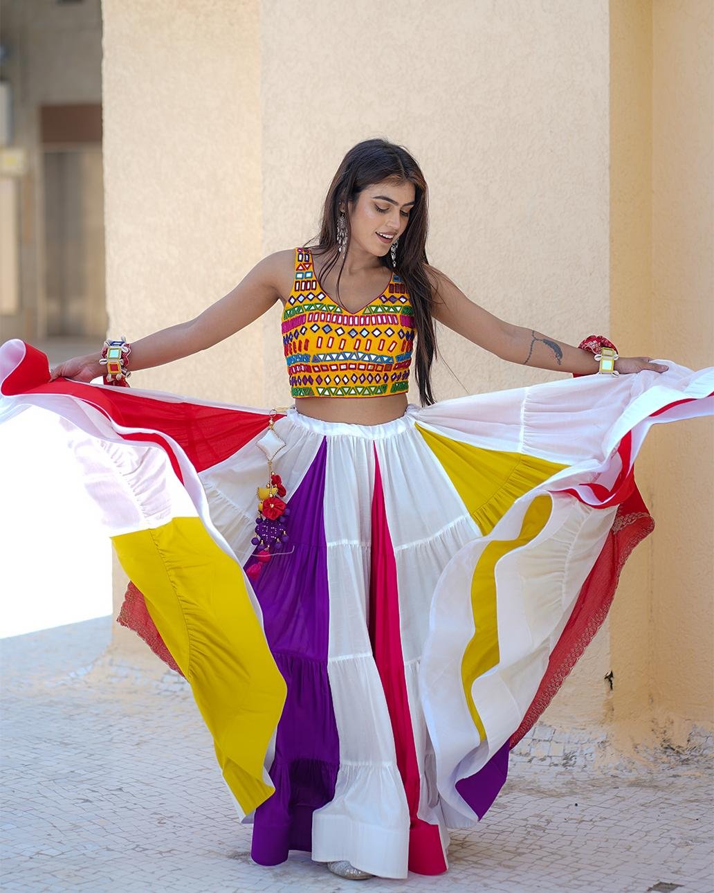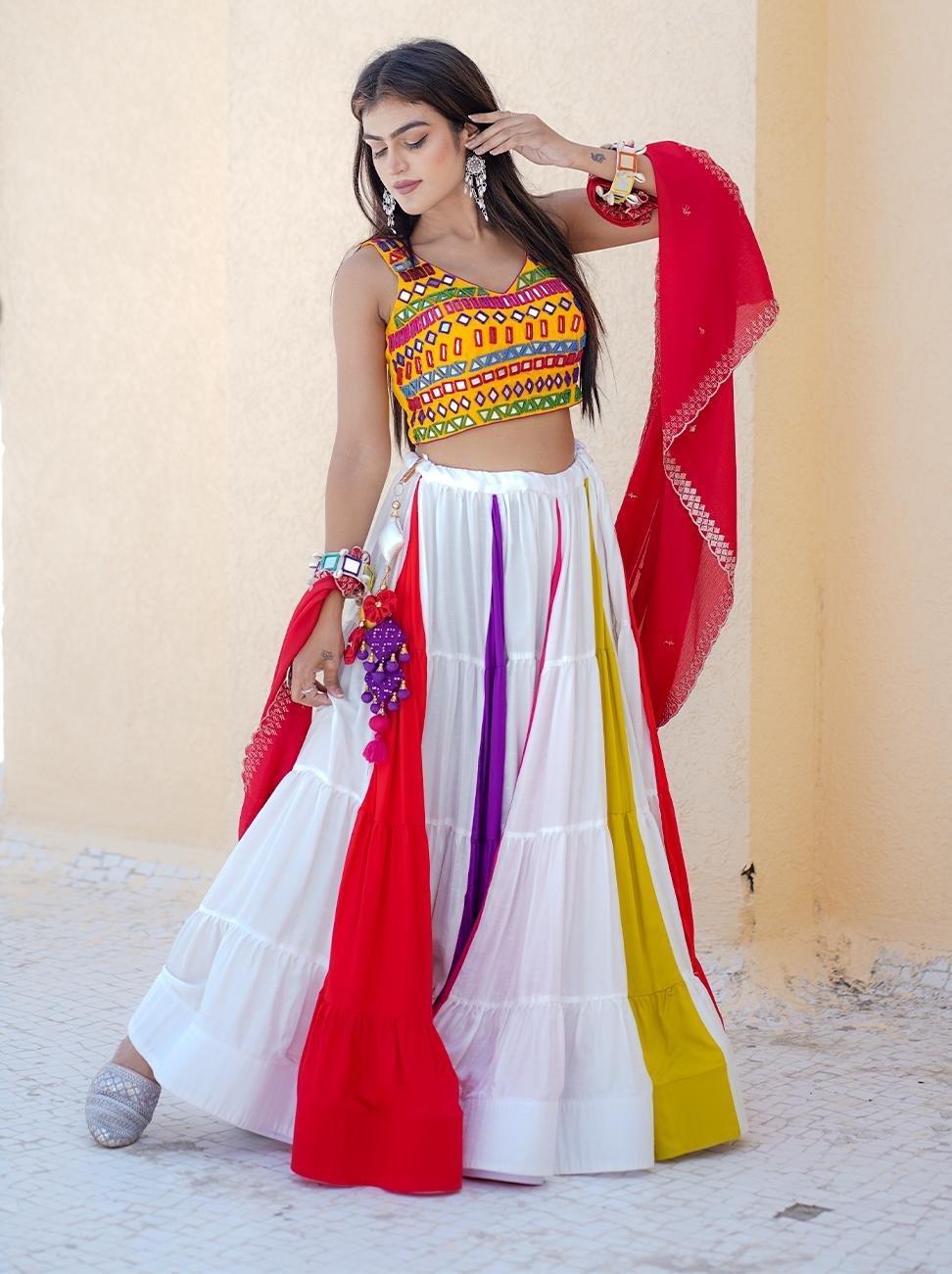 Festive Multicolour Chaniya Choli in rich Dola Silk (20 Mtr Flair). Includes a sparkling Mirror Work blouse and a soft Chiffon dupatta with intricate Aari Work.