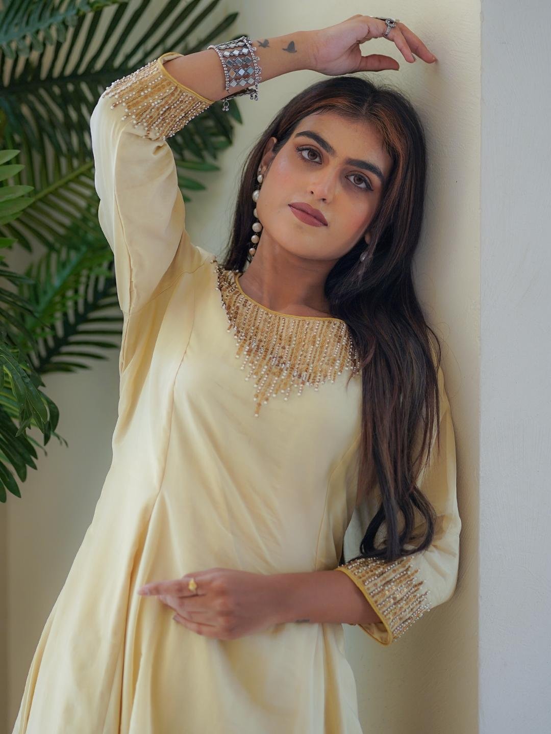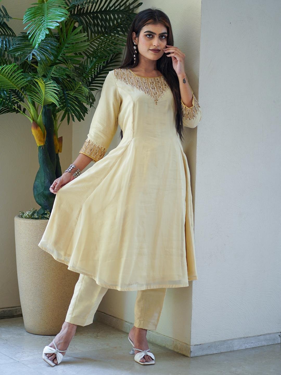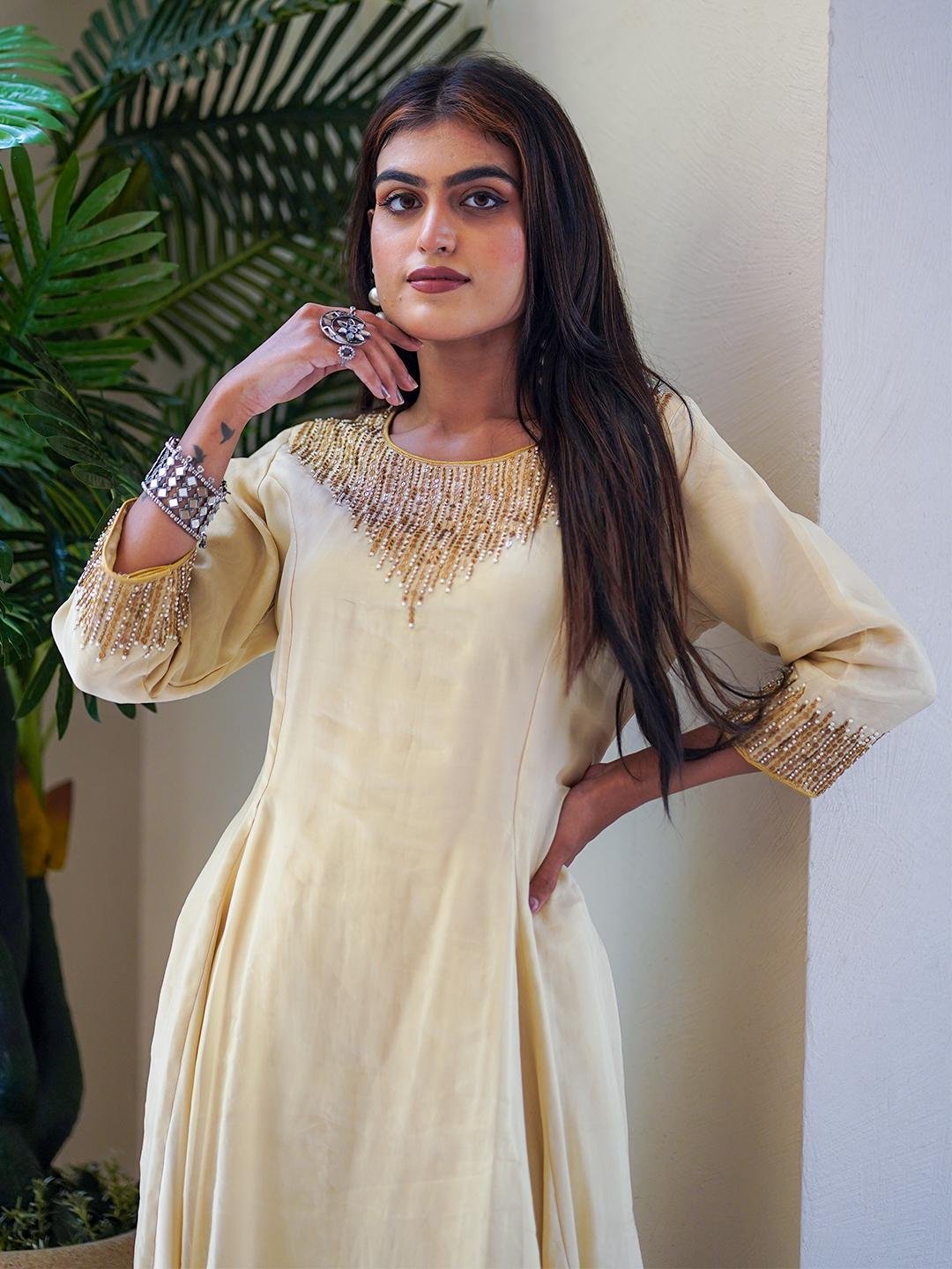 Graceful Organza Silk A-Line Dress (Princess Cut) with beautiful Khatli Work and Sequins. Two-piece set.