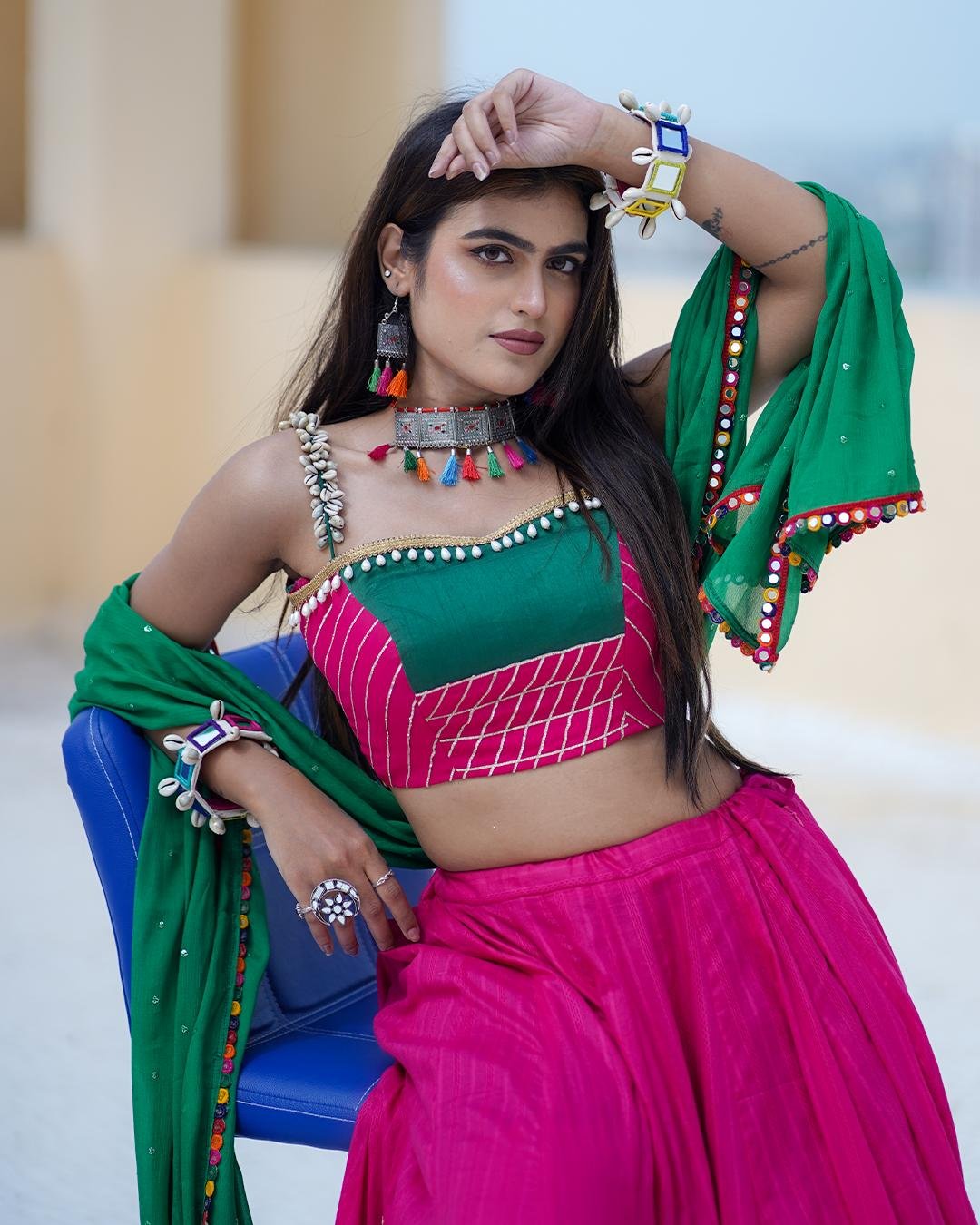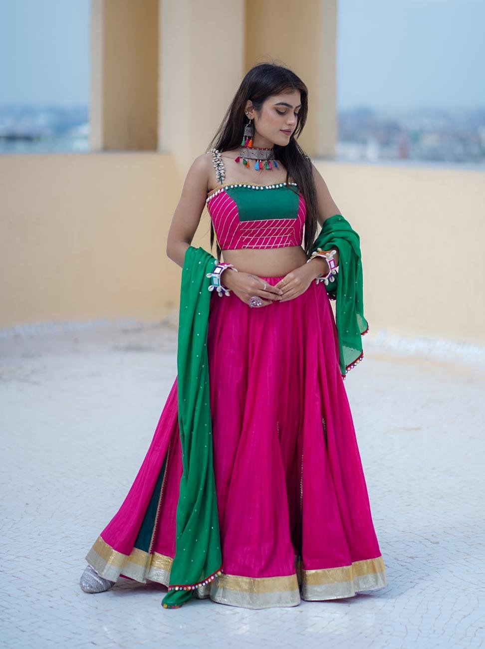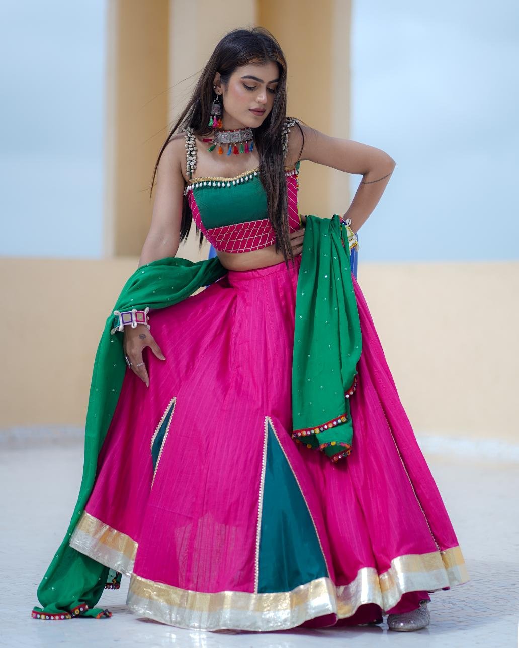 Comfortable Pink Cotton Chaniya Choli (12 Mtr Flair) featuring a festive Mirror Work blouse and an elegant Green Chiffon dupatta.