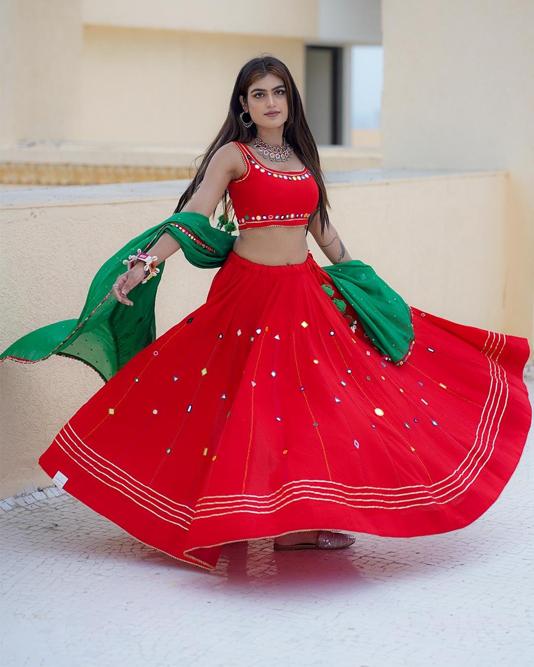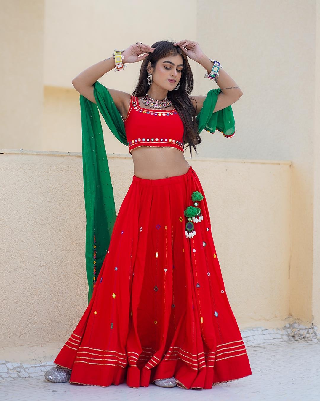 Festive Red Rayon Chaniya Choli (10 Mtr Flair) with a dazzling Mirror Work blouse and a contrasting Green Chiffon dupatta with a mirror work border.