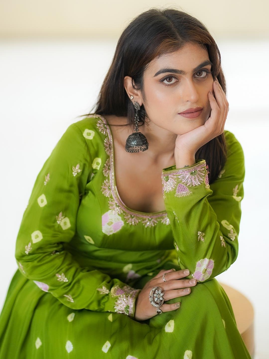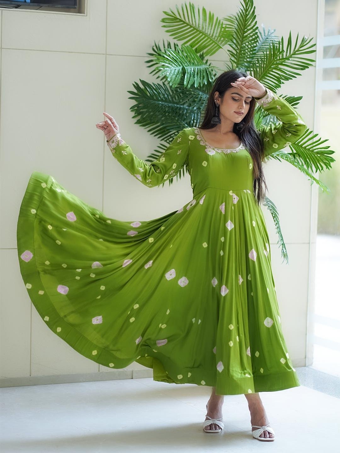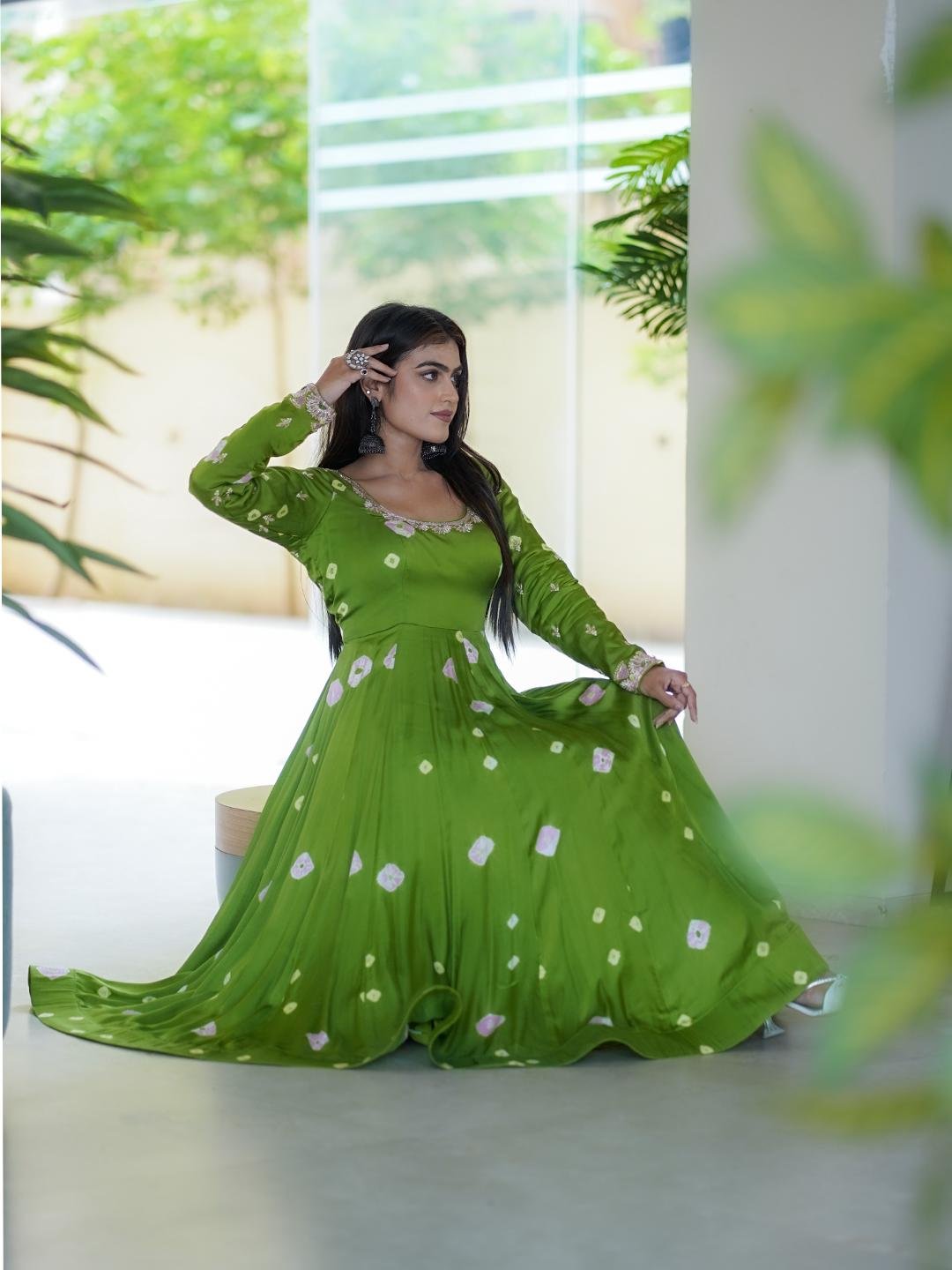 Exquisite Modal Silk Anarkali Dress (8 Mtr Flair) featuring vibrant Bandhani Print and detailed Khatli Work.